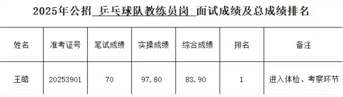 據(jù)北京市體育局官網(wǎng),北京市先農(nóng)壇體育運(yùn)動(dòng)技術(shù)學(xué)校公布2025年公開(kāi)招聘乒乓球隊(duì)教練員崗面試成績(jī)及總成績(jī)排名。王皓筆試成績(jī)70,實(shí)操成績(jī)97.80,綜合成績(jī)83.90,排名第一,進(jìn)入體檢、考察環(huán)節(jié)。據(jù)悉,此前國(guó)乒運(yùn)動(dòng)員王楚欽考編上岸,聘用至北京市先農(nóng)壇體育運(yùn)動(dòng)技術(shù)學(xué)校乒乓球隊(duì)運(yùn)動(dòng)員崗。