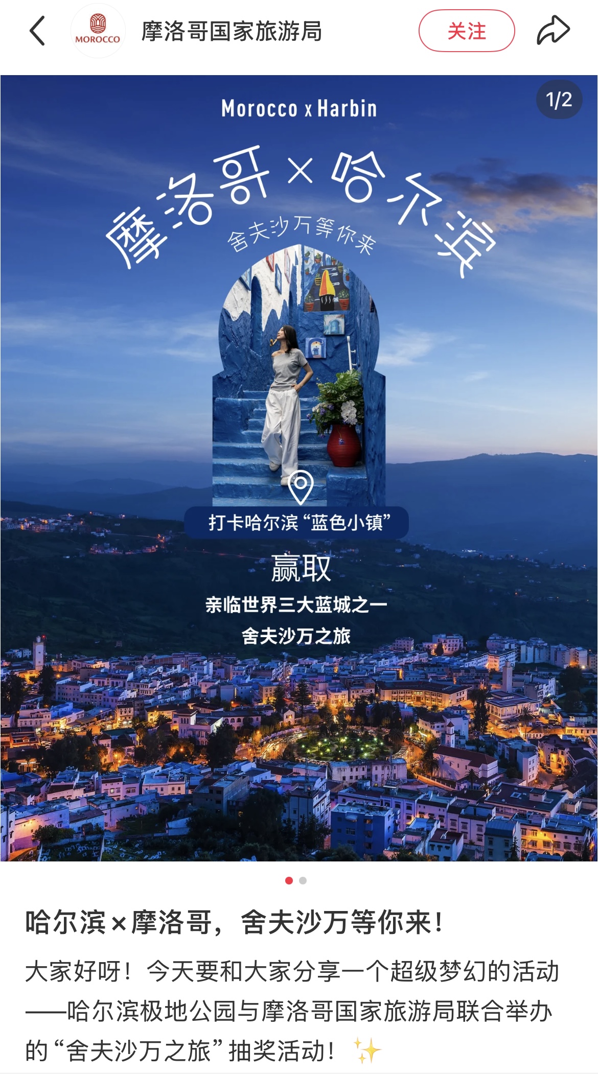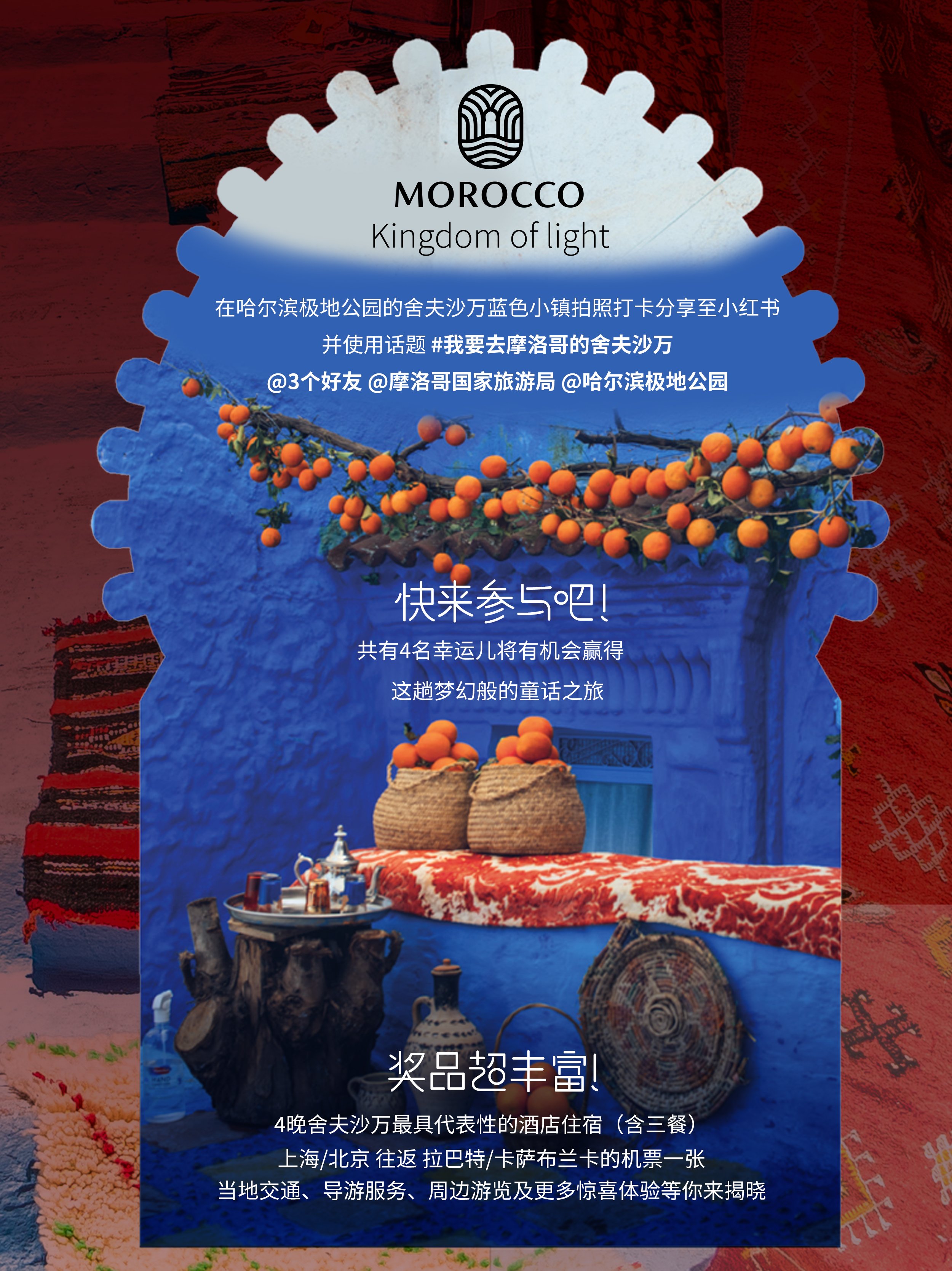 作為哈爾濱新晉熱門地標(biāo),哈爾濱“摩洛哥藍(lán)色小鎮(zhèn)”不僅完美還原了舍夫沙萬的藍(lán)白建筑美學(xué),更成為連接龍江冰雪文化與北非異域風(fēng)情的重要紐帶。以“藍(lán)色小鎮(zhèn)”為起點(diǎn),哈爾濱極地公園將攜手摩洛哥國(guó)家旅游局開展系列深度文化交流合作,雙方聯(lián)合舉辦“舍夫沙萬之旅”旅游活動(dòng),邀請(qǐng)幸運(yùn)游客親臨摩洛哥開啟沉浸式體驗(yàn)之旅,同時(shí)摩洛哥國(guó)家旅游局將提供包含機(jī)票、酒店在內(nèi)的重磅禮遇;未來,摩洛哥當(dāng)?shù)厮囆g(shù)家也將來到哈爾濱進(jìn)行進(jìn)一步文化交流,通過藝術(shù)表演、文化展覽等形式,讓冰城游客也能沉浸式體驗(yàn)?zāi)β甯绲镊攘?,促進(jìn)兩地文化間的交流互鑒。