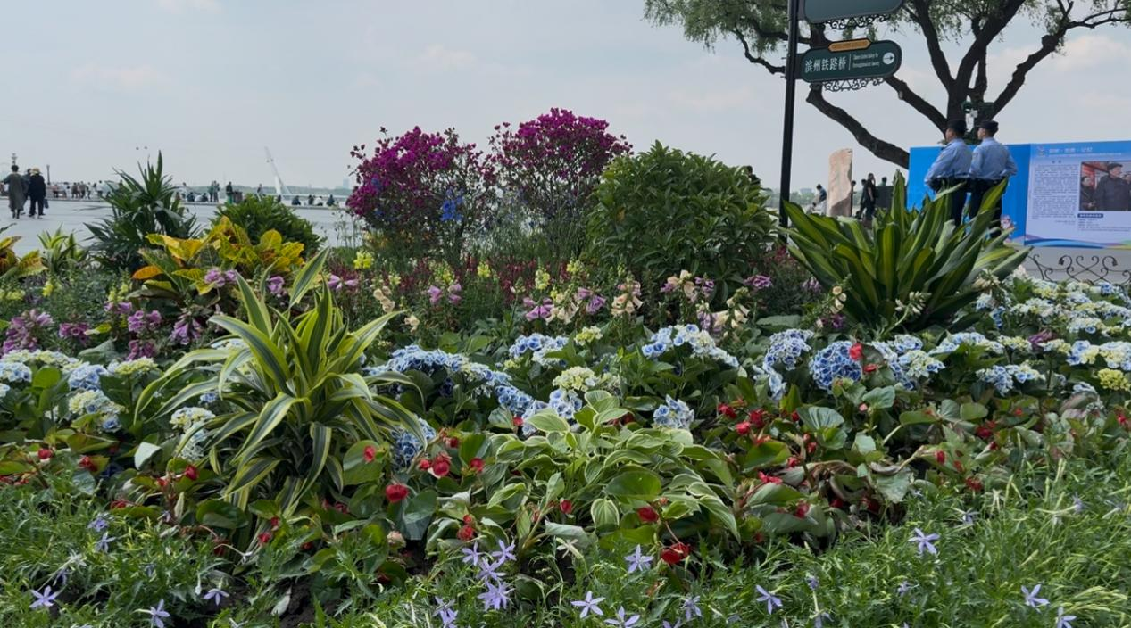 到了防洪紀(jì)念塔旁,更像闖進了一場色彩的對話。藍(lán)雪花的清涼、繡球的飽滿、變?nèi)~木的五彩葉片,在陽光下撞出熱烈的火花;毛地黃舉著“小喇叭”向上生長,六蓓利、佛甲草鋪成一片柔軟的“花毯”,藏在其間的彩星花,正悄悄綻開藍(lán)色的“五角星”——剛勁的紀(jì)念塔與溫柔的花境相望,剛?cè)嵯酀?,成了江畔最動人的新地?biāo)。